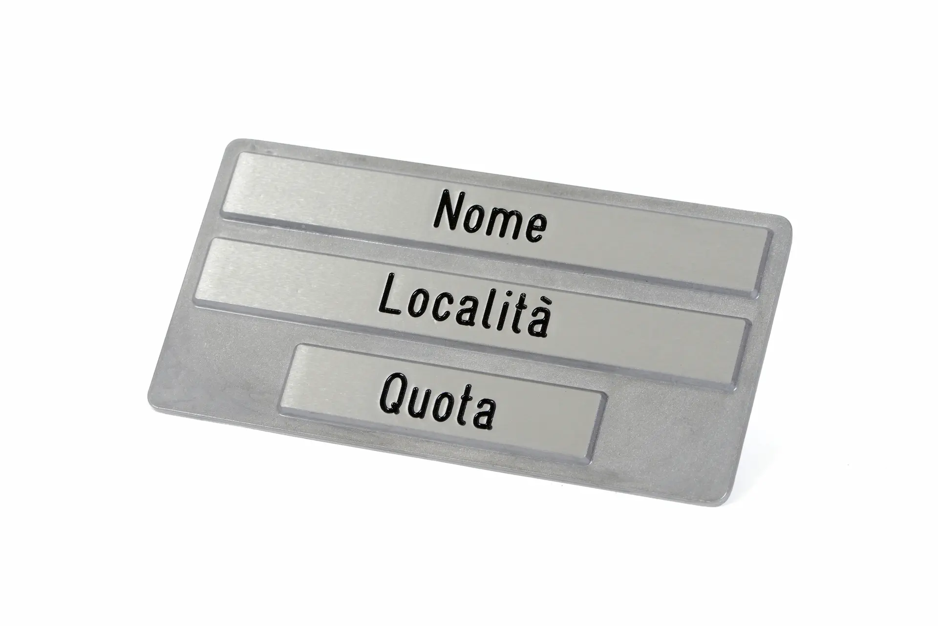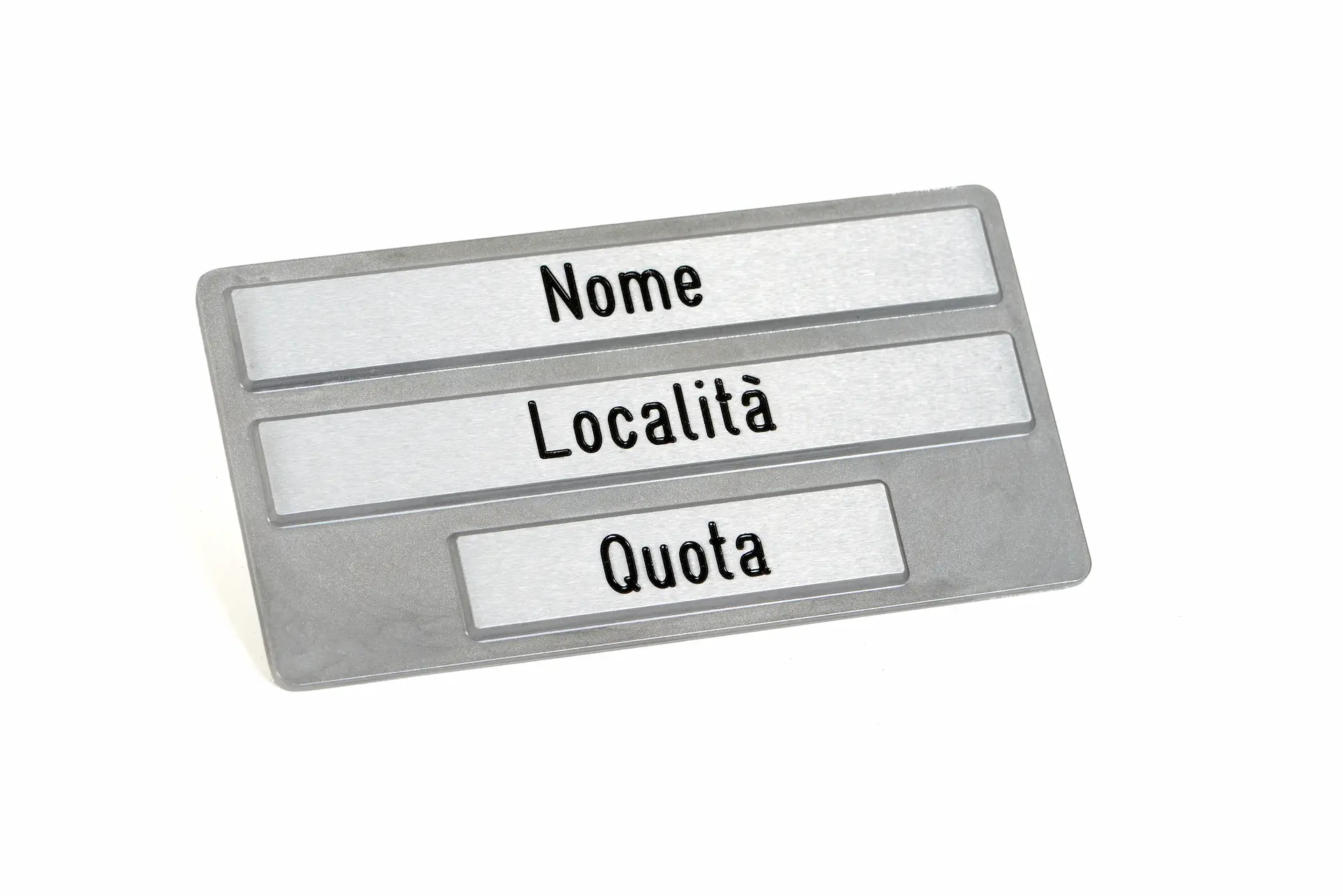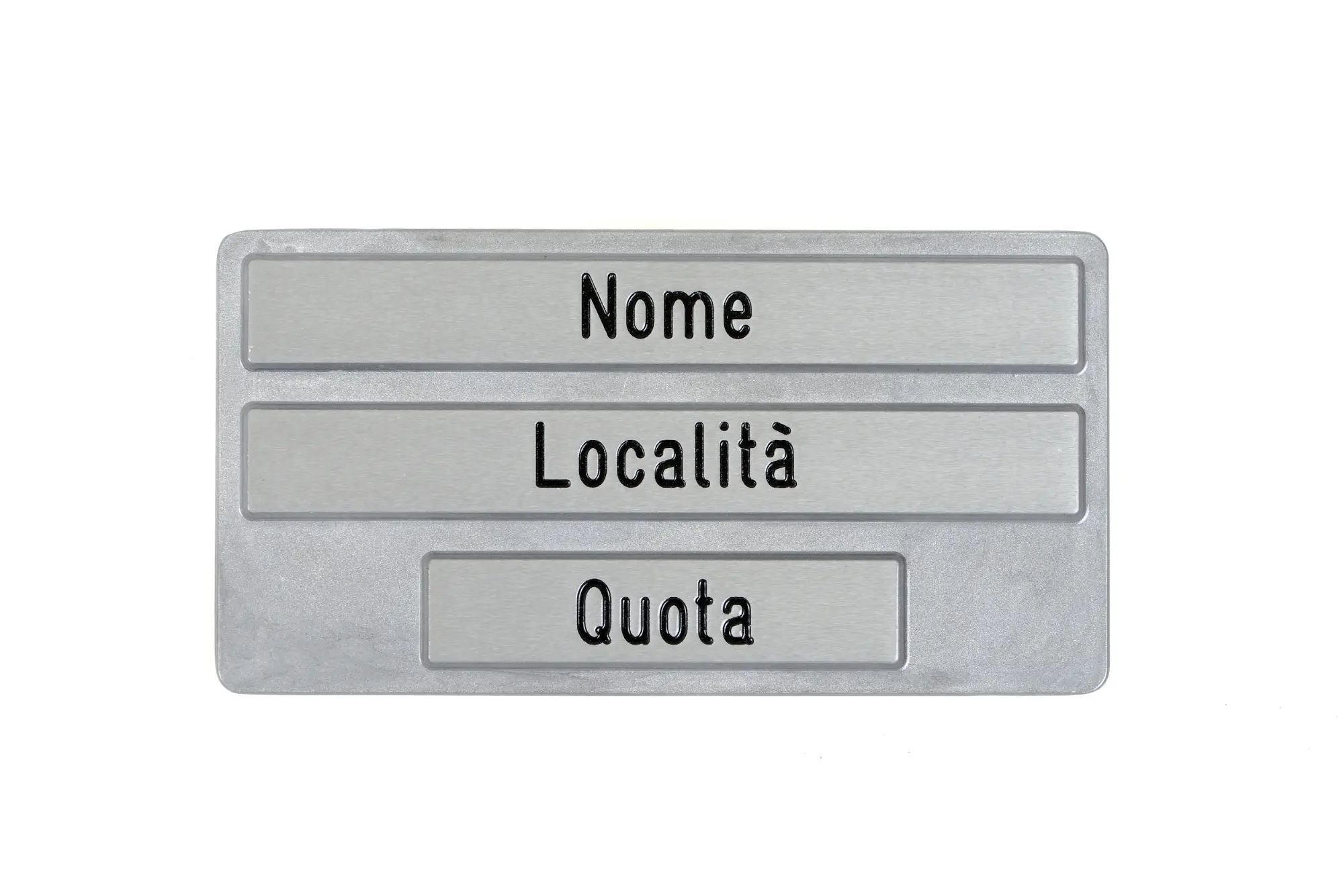 Dimensione: 250 X 130 MM Sulla facciata anteriore vi sono tre strisce in rilievo dove incidere le indicazioni Le diciture incise sono allineate al centro della tabella e verniciate in nero Sulla facciata posteriore è inclusa una semistaffa con incavo tondo e fori filettati per permettere il bloccaggio al palo La tabella è verniciata con cicli di vernice trasparente per la protezione da agenti atmosferici Il cartello è completo di semistaffa fusa e due viti in acciaio inox per il fissaggio al palo Ø 48 mm (su richiesta è possibile adattare la tabella al fissaggio al palo diametro 60 mm)La tabella di località, realizzata in allumino pressofuso, si colloca agli incroci più significativi di un percorso (passi, forcelle, piccoli centri abitati), è utile per indicare il nome della località dove ci si trova e la relativa quota.